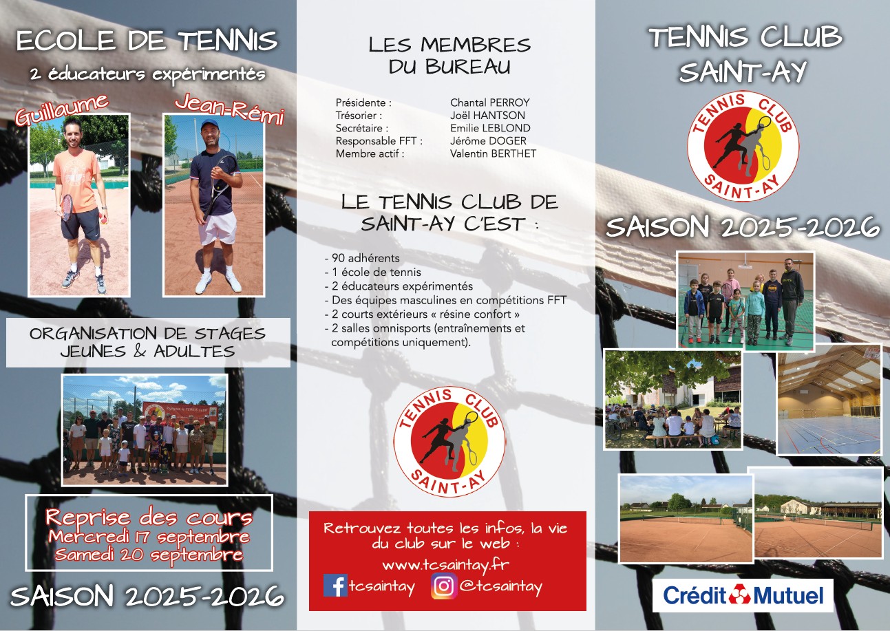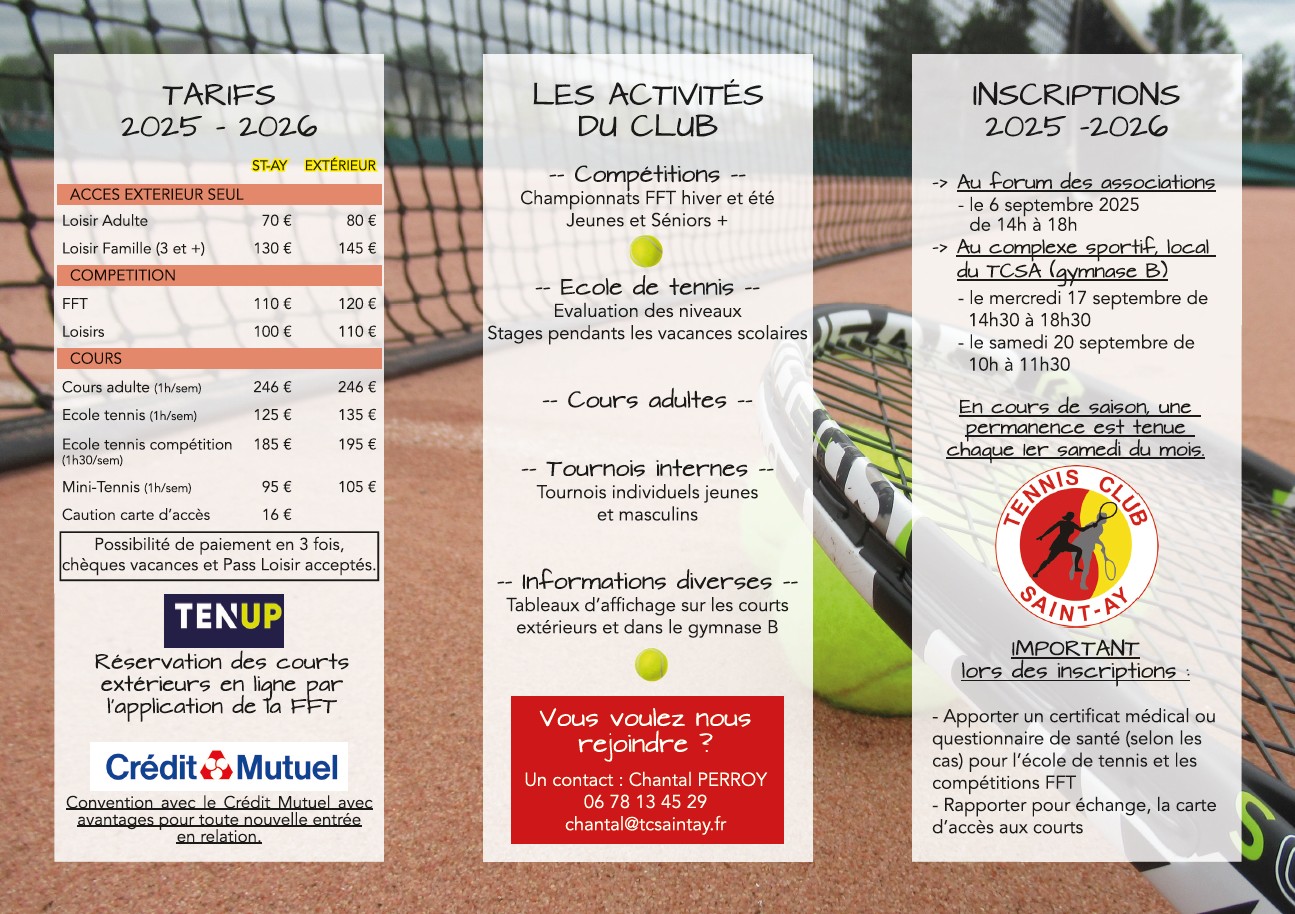 Tarifs 2025 / 2026 Cautions Carte d’accès aux courts extérieurs : 16€ Notre plaquette Vous souhaitez avoir des information? Vous voulez vous inscrire? Contactez notre présidente, Chantal Perroy, au 06 78 13 45 29